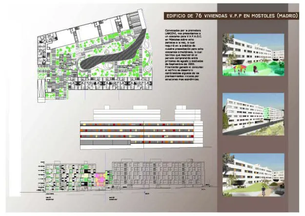 Convocados por la promotora Larcovi, nos presentamos a este concurso para VPPAOC en Móstoles sobre ocho parcelas a la vez, lo cual requirió en la práctica nuestra presentación para ocho concursos simultáneos, lo cual tuvimos que resolver en el período comprendido entre primeros de agosto y mediados de septiembre del 2005.