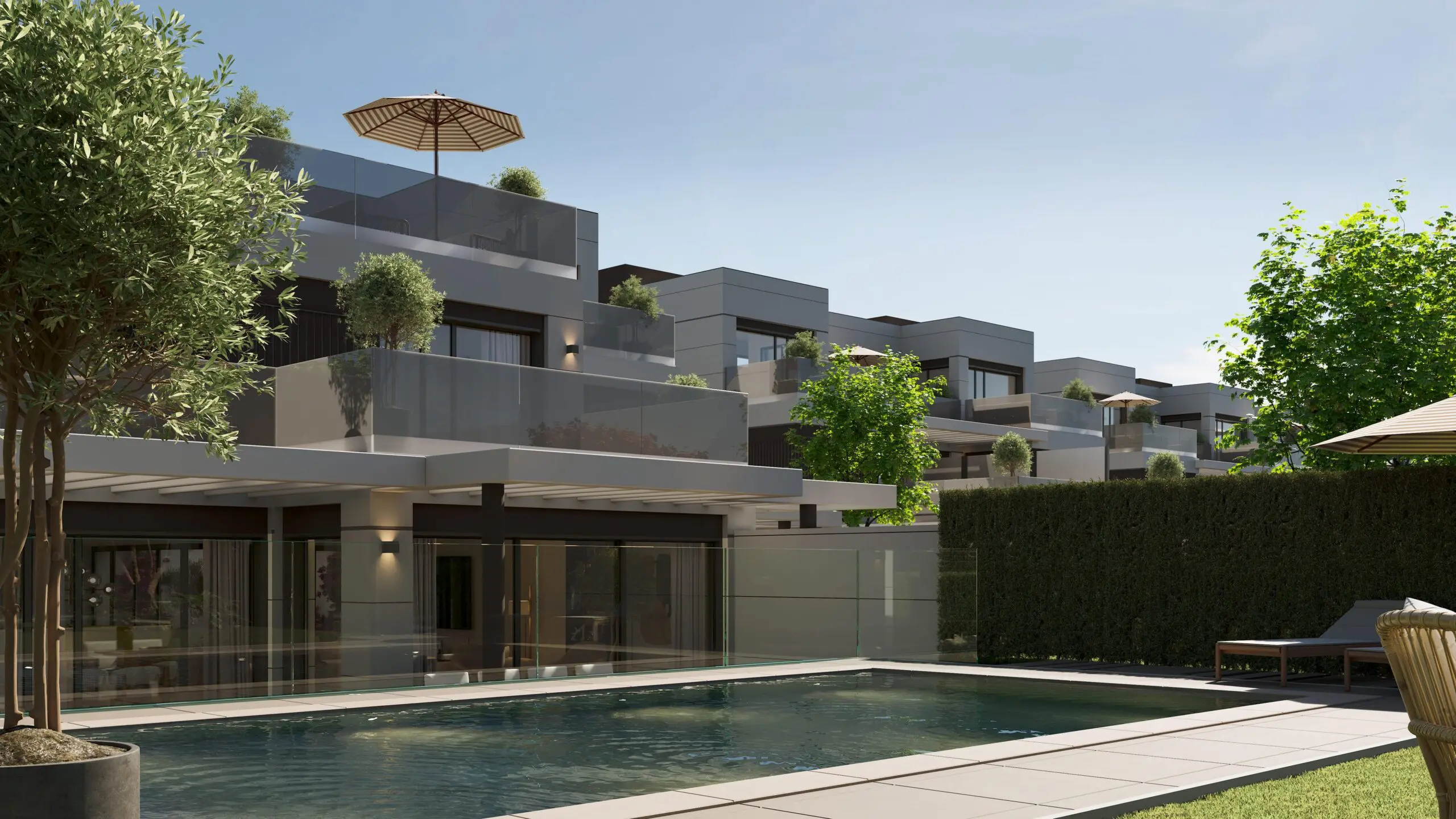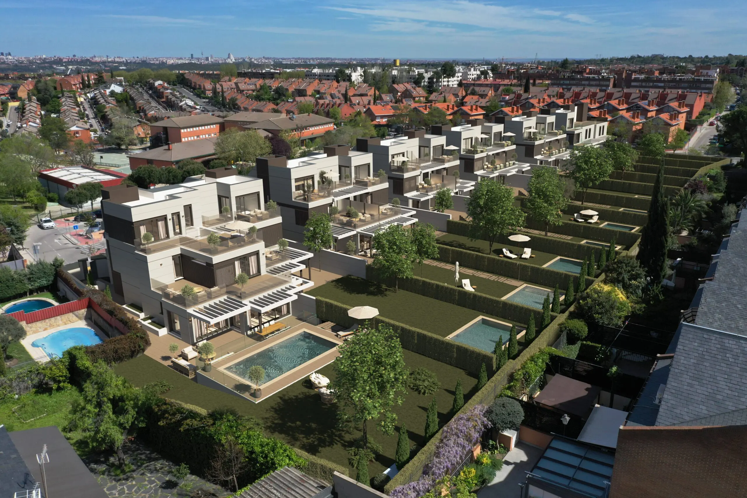 Ante esta oportunidad, la promotora encargó un proyecto de viviendas exclusivas sin zona común, que tuvieran cada una de ellas su acceso independiente a garaje, su piscina y parcela con jardín privado y una gran cantidad de terrazas y espacios exteriores.