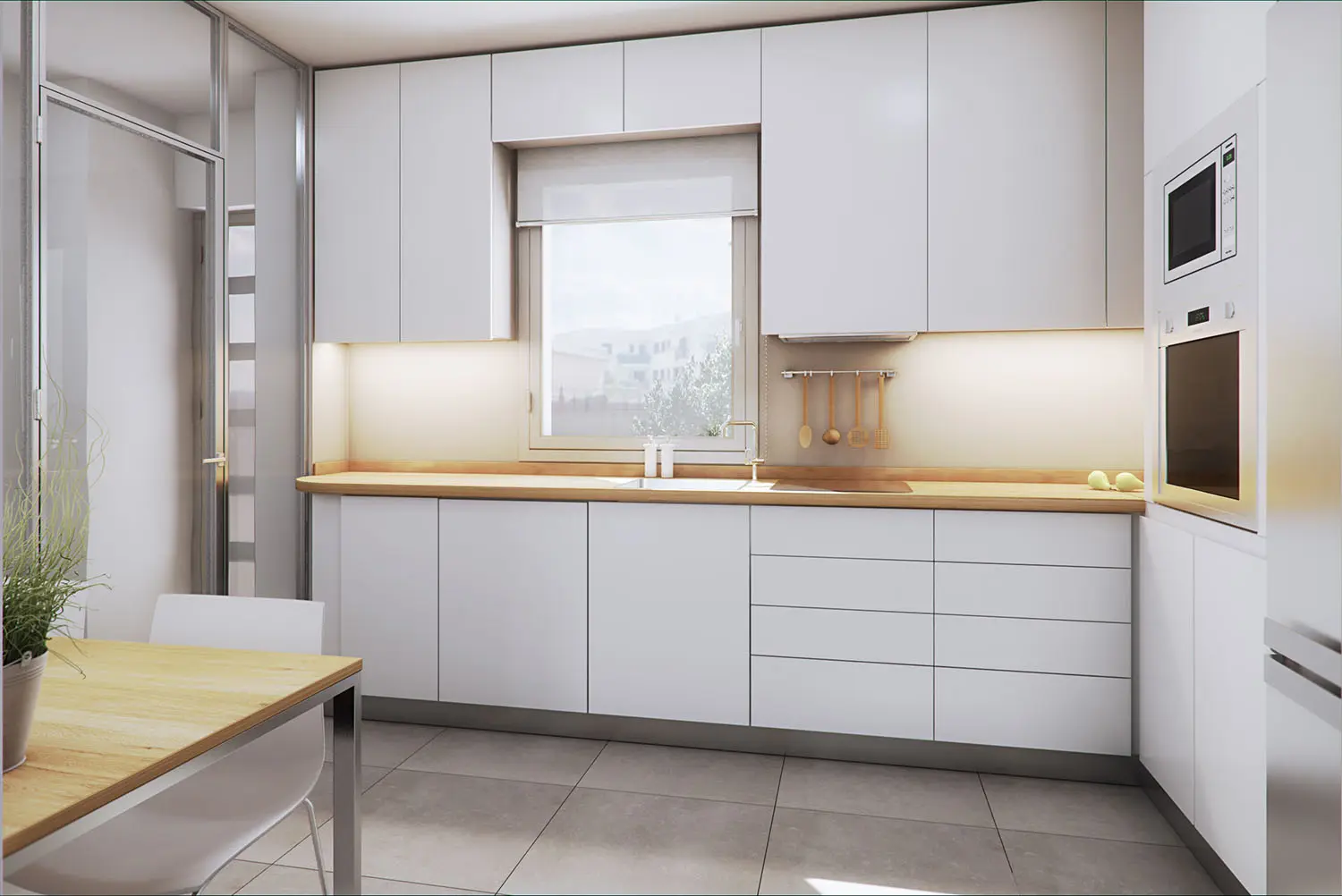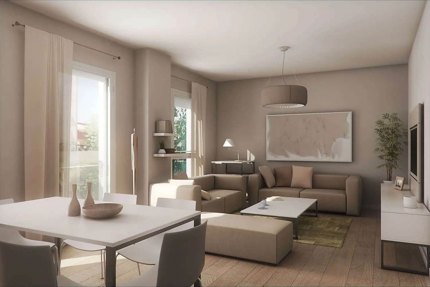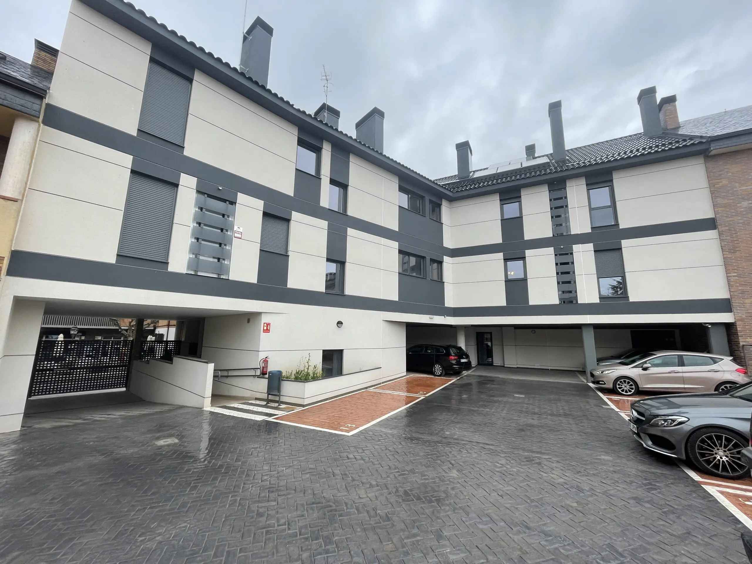 Por contraposición, el vacío interior de la promoción pretender ser un espacio amable capaz de compatibilizar un garaje en superficie con un espacio de relación vecinal. Como solución a este requerimiento surge un elemento de cubrición solar que se ve apoyado por las jardineras de la promoción y diseño del pavimento.