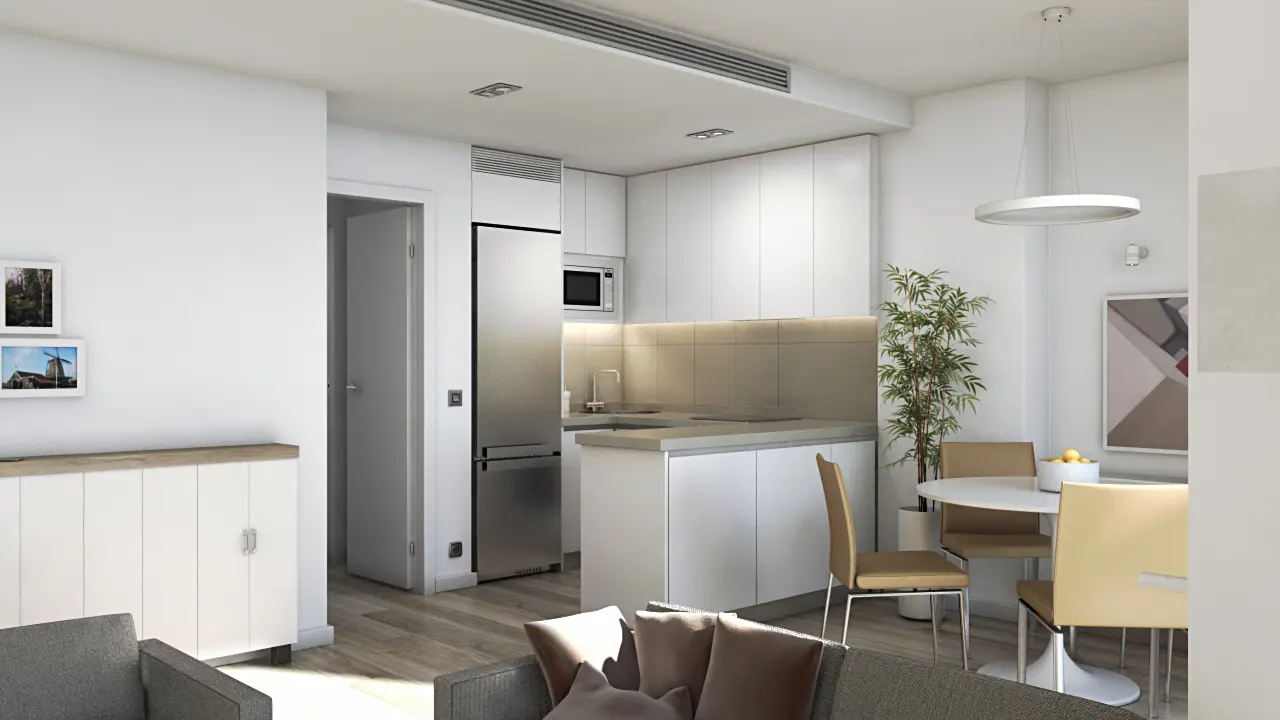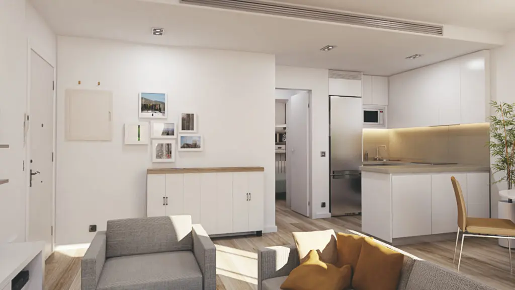La promoción residencial cuenta con viviendas de 1 y 2 dormitorios con espacios lo más diáfanos posibles para conseguir la mayor amplitud posible con las circunstancias de las que se parten de base. Tanto planta baja como primera quedan destinadas a los usos comunitarios, mientras que planta primera, segunda, tercera y ático se emplean para el uso residencial.