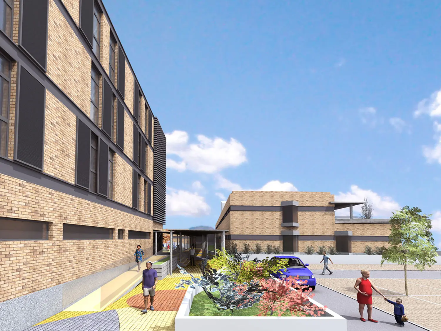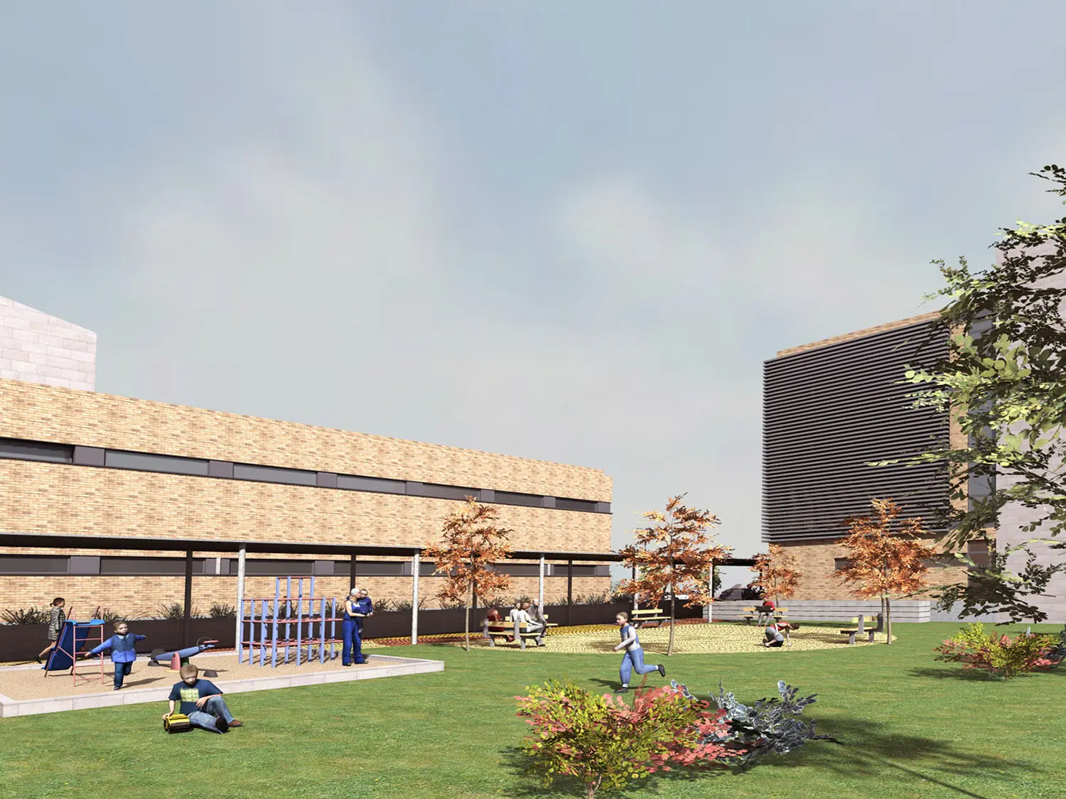 El tercer bloque de 3 plantas aloja todo el resto del programa (área de Intervención Social y acompañamiento Madrina, área de salud y terapia ambulatoria y Dirección y Gerencia de 3.948,05 m2. Cada uno de estos bloques cuenta con acceso directo desde el exterior de la parcela, y se conectan entre sí mediante un eje peatonal interior. Los espacios exteriores son tratados con un cuidado proyecto de jardinería, reservando una amplia zona para recreo de los niños residentes.