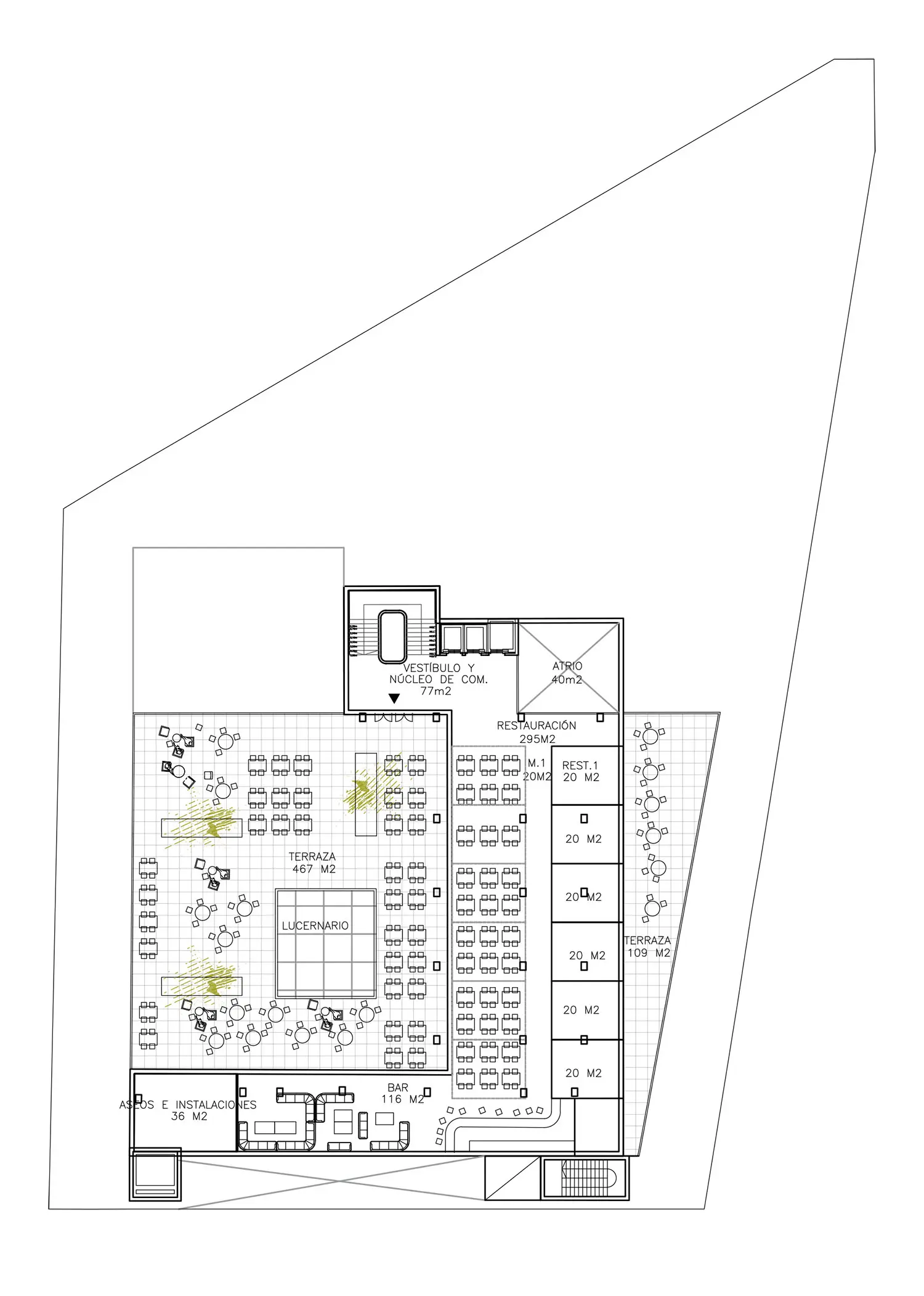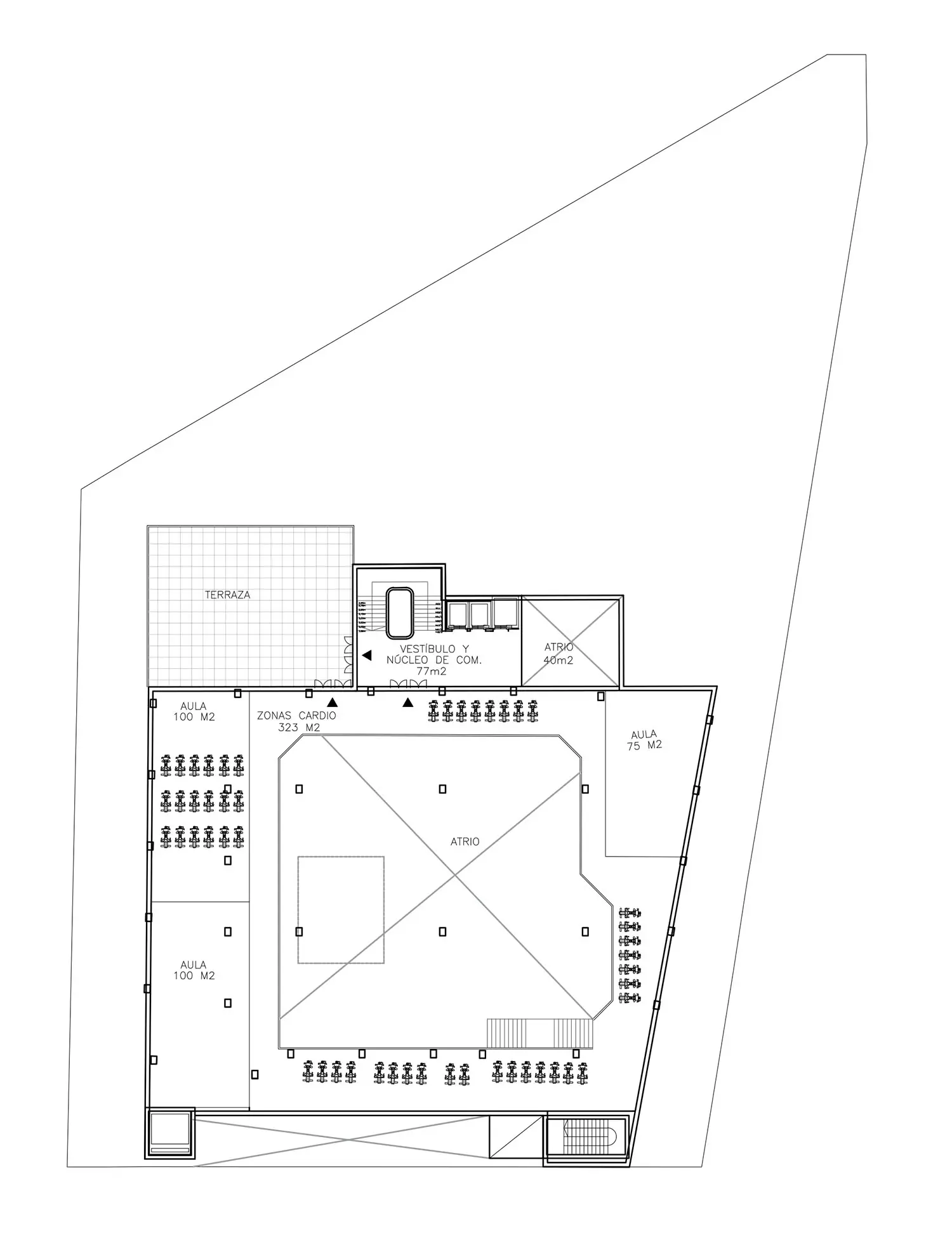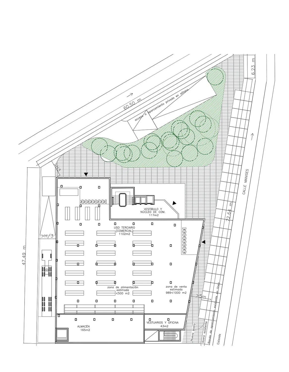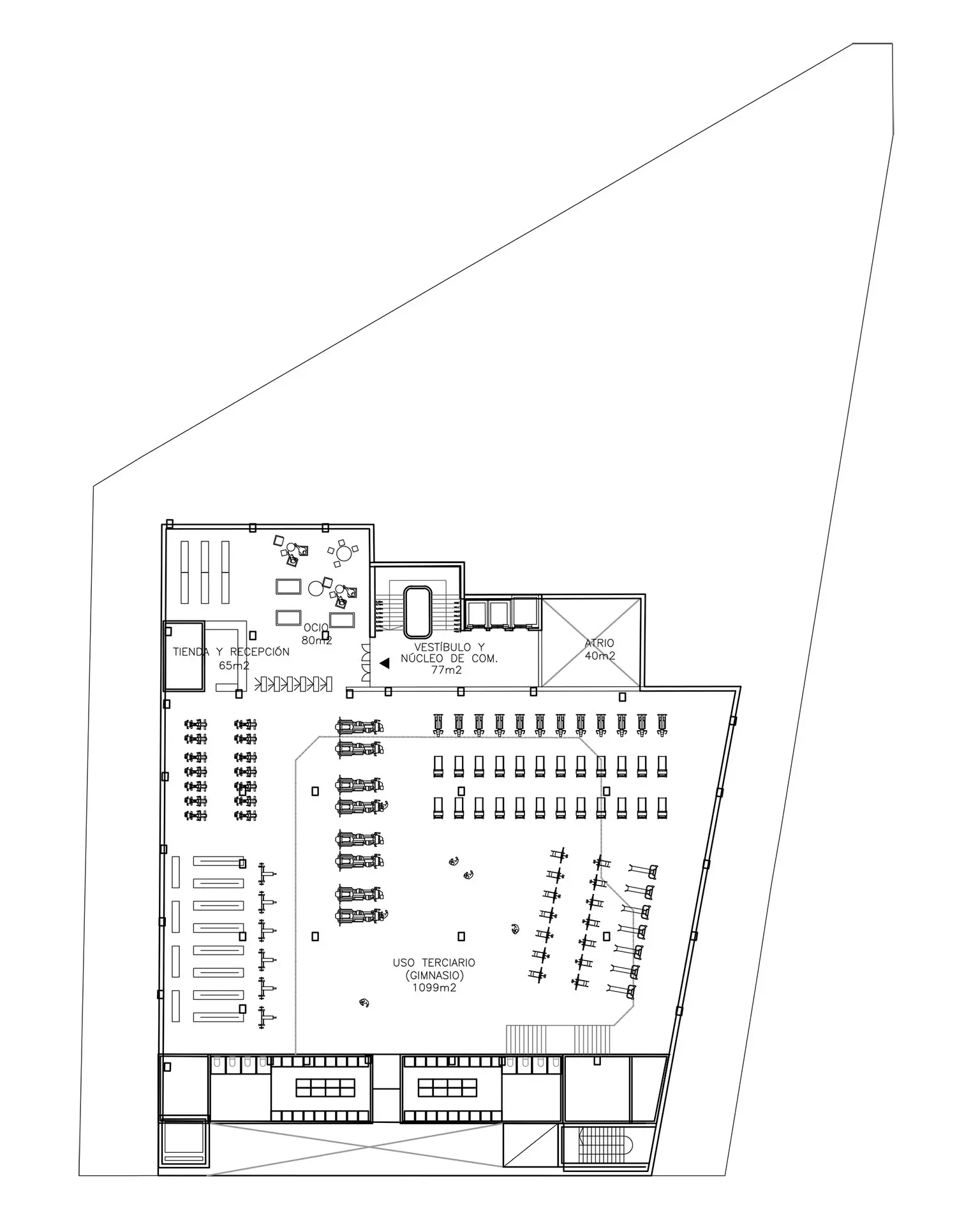 De esta forma se estructura el edificio por plantas que albergan los diferentes usos. En la planta baja se establece el uso terciario-comercial, con instalación de comercio minorista menor de 1.000 m2 de superficie de ventas, de los cuales la alimentación será en todo caso, inferior a 500 m2. En plantas primera y segunda se establece el uso terciario-servicios mediante un gimnasio urbano gestionado por personal especializado que da servicio a la población residente y a los trabajadores del sector industrial próximo. En la tercera planta se propone el uso terciario-restauración, mediante la implantación de uno o varios operadores comerciales en locales de pequeñas dimensiones, a modo de agrupación comercial en una sola planta, compartiendo zonas estanciales y que puede contribuir a dinamizar el entorno.