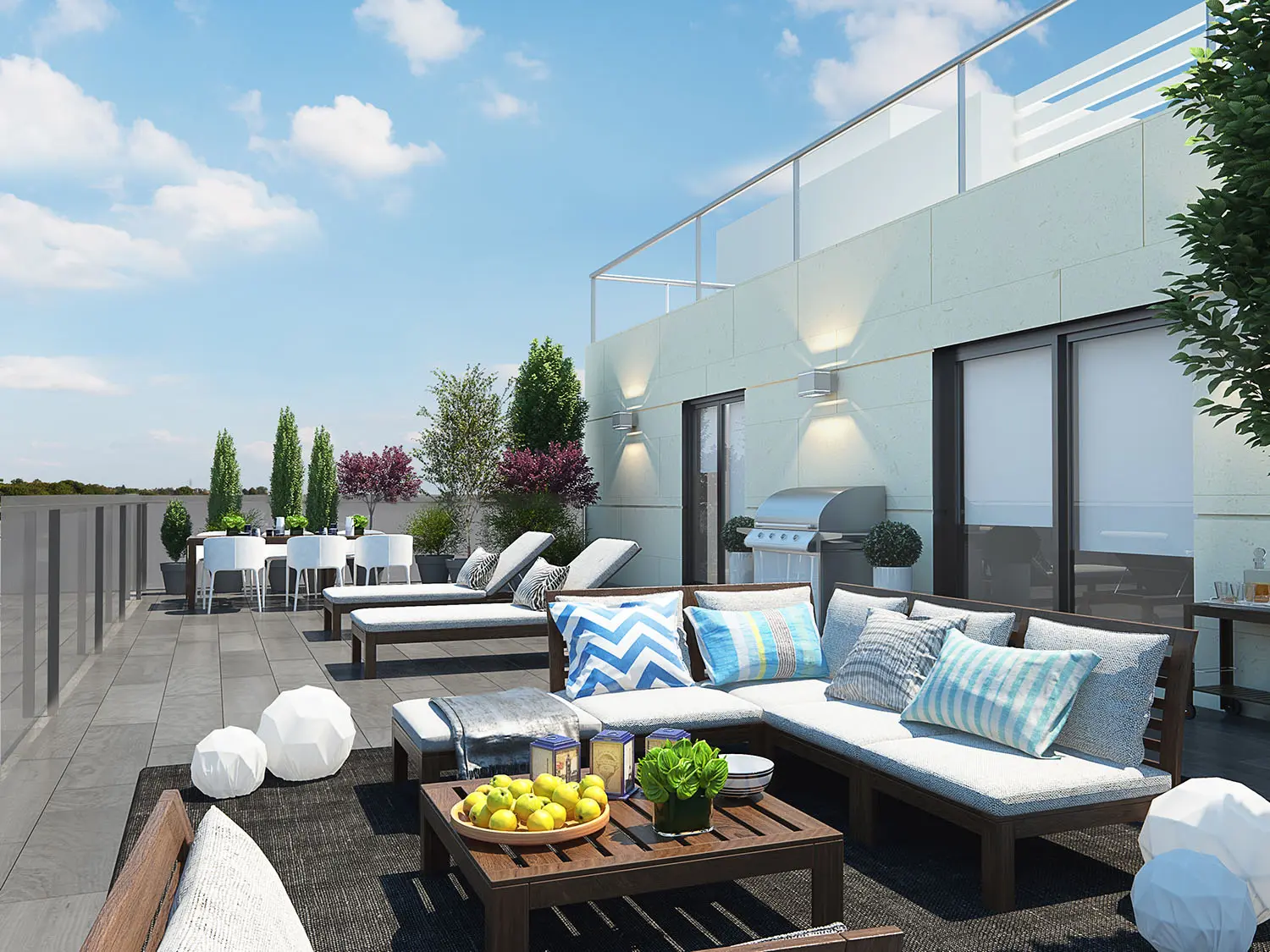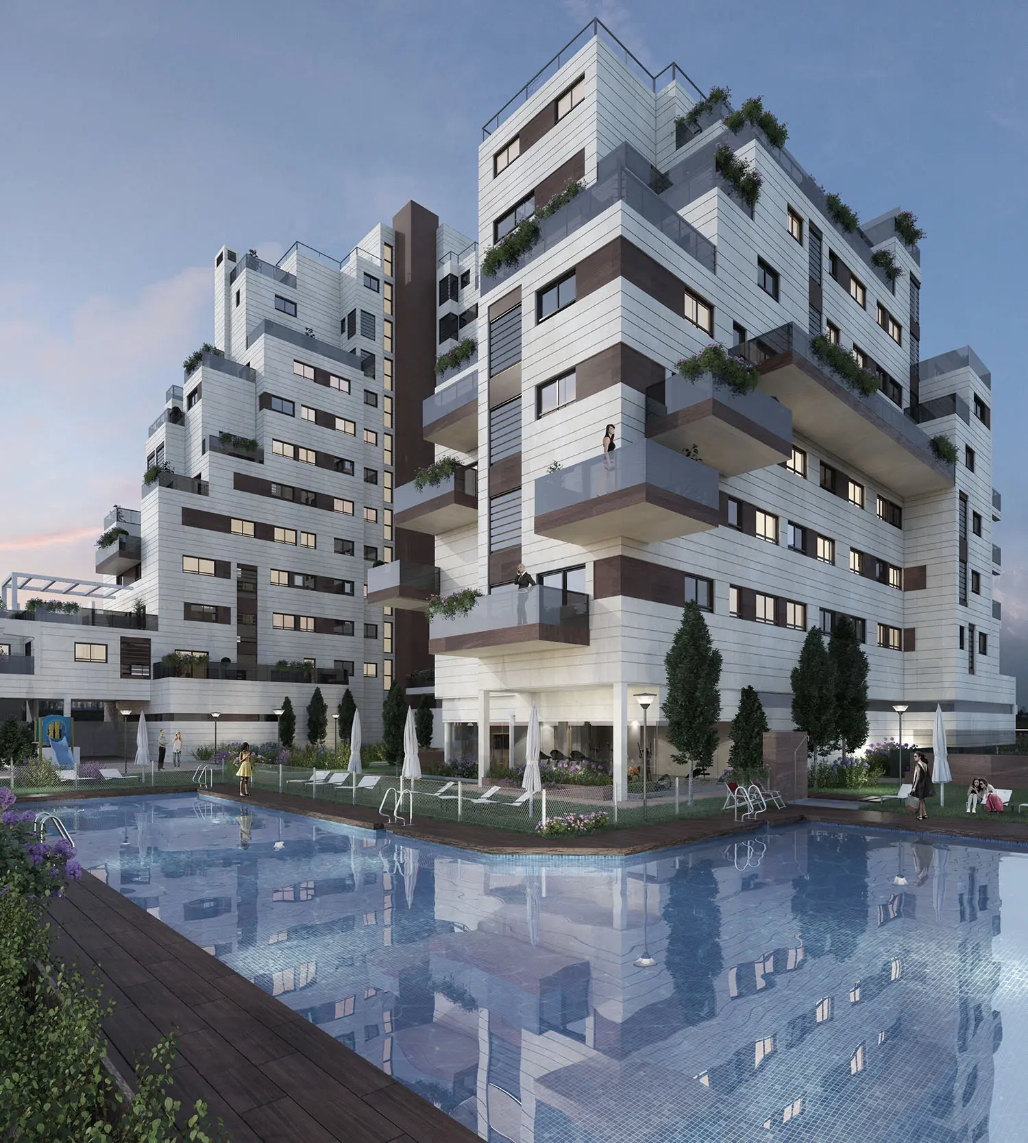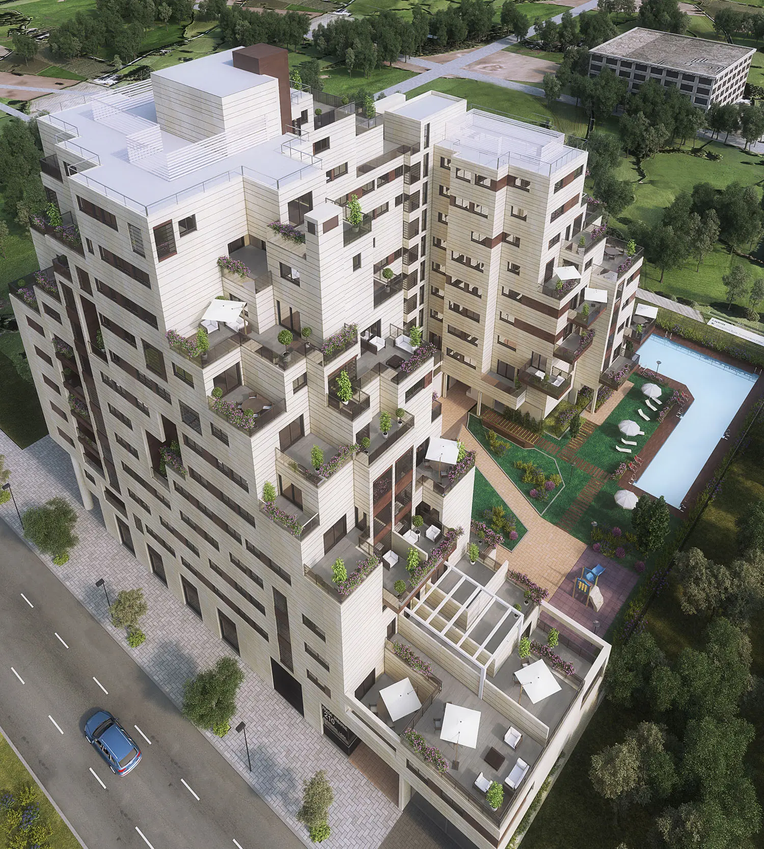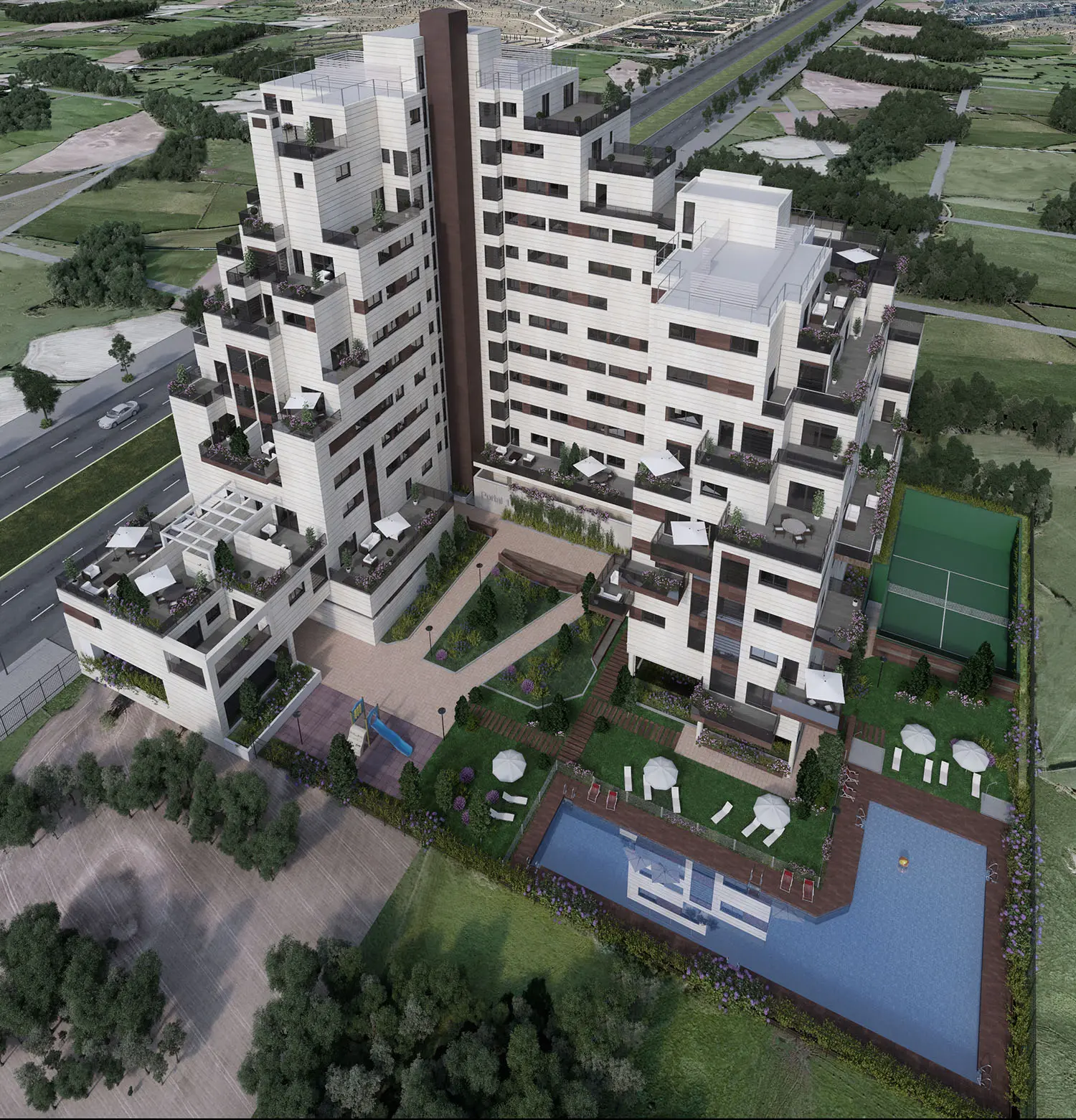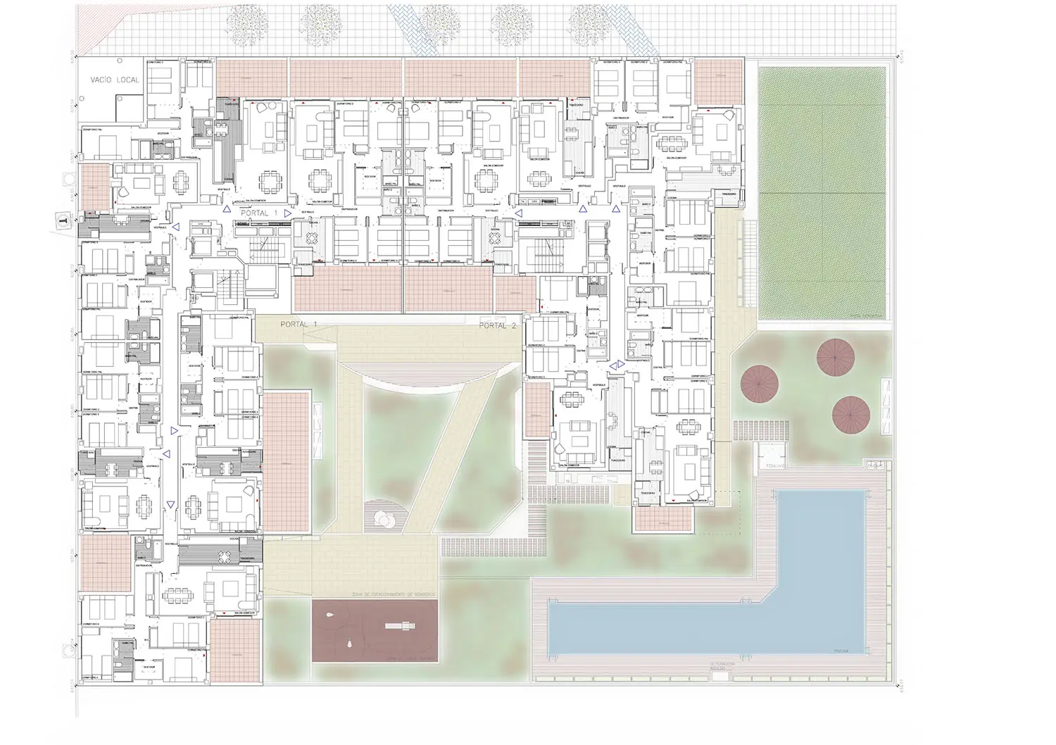 Satisfaciendo las necesidades del programa planteado por PREMIER España, se proyecta un edificio de 80 viviendas con sus correspondientes equipamientos y zonas comunes. Las plantas bajas quedan destinadas a locales comerciales, accesos y pista deportiva, mientras que las dos plantas bajo rasante ubican las instalaciones, aparcamiento y trasteros.