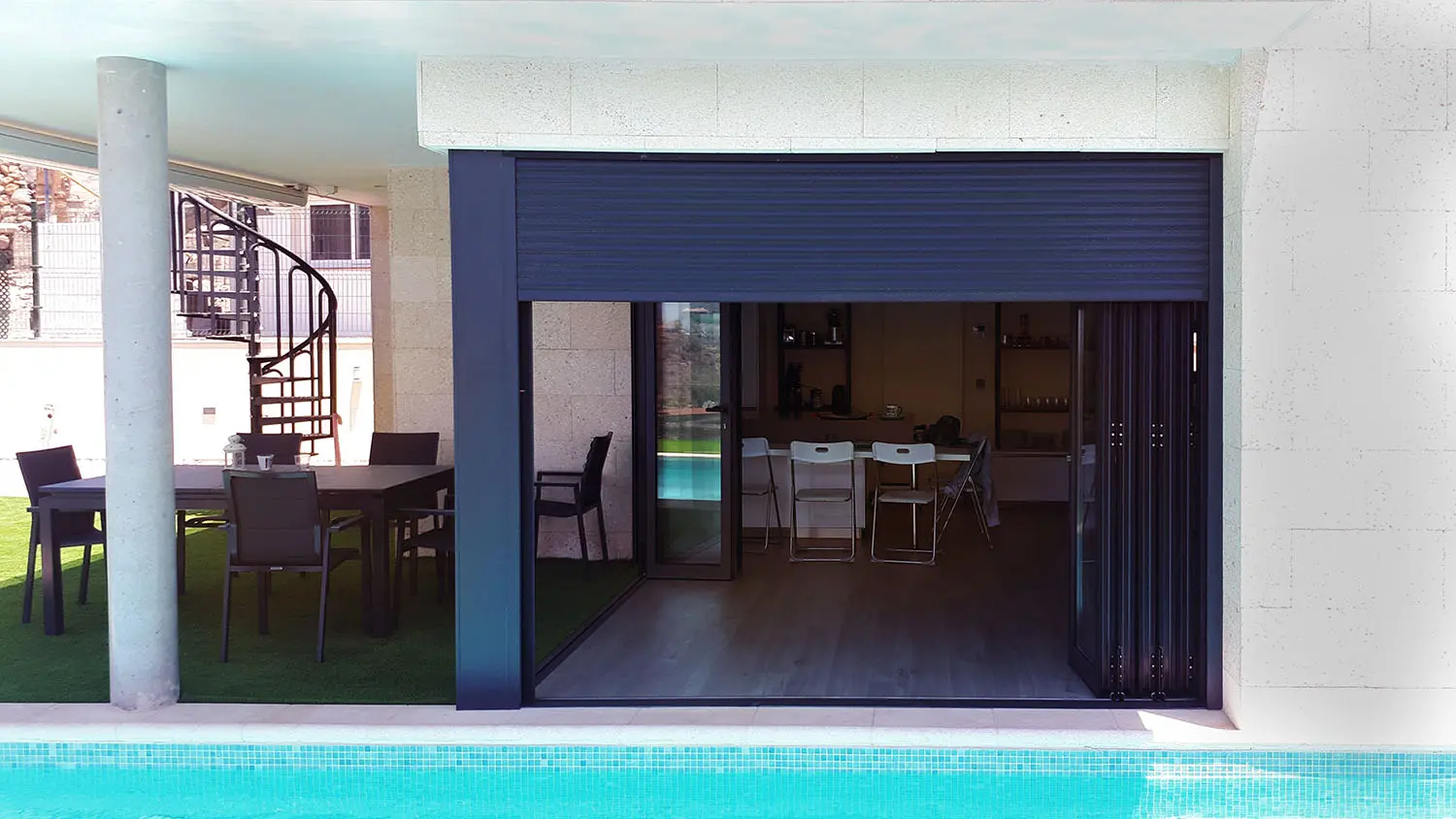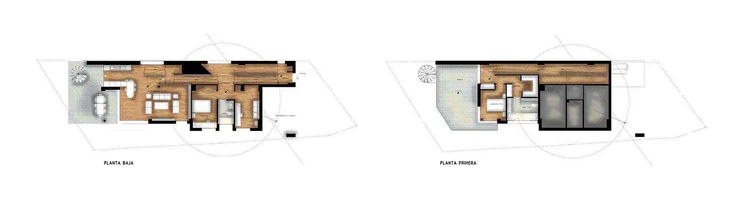 La planta baja queda destinada a las actividades principales y se plantea totalmente permeable a la parcela, potenciando la relación con la zona de piscina situada en el exterior. Ésta alberga cocina y almacenamiento correspondiente, salón-comedor, baño y dos dormitorios secundarios. En la planta superior se concentran los usos más privativos, desarrollando el dormitorio principal con baño, vestidor y una amplia terraza orientada al paisaje circundante.