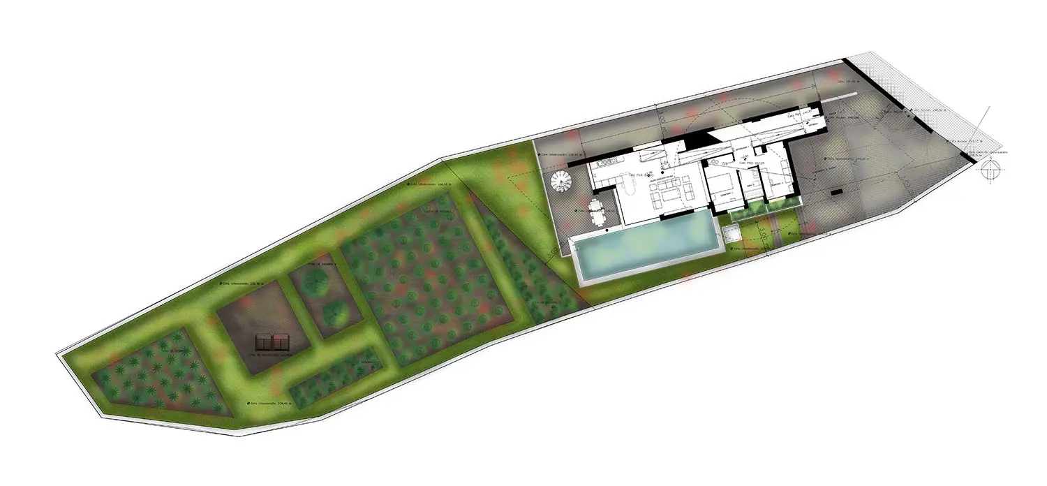 La parcela queda dividida en diferentes zonas que responden a la forma en la que se va a vivir en ella. En primer lugar la zona inmediata al cerramiento exterior, reservada para el acceso de vehículos y peatonal con la totalidad de espacios complementarios a estos usos. En segundo lugar la zona intermedia de la parcela, destinada a la vivienda, piscina y principales zonas estanciales y de ocio. En tercer lugar, el espacio del huerto con el equipamiento necesario.