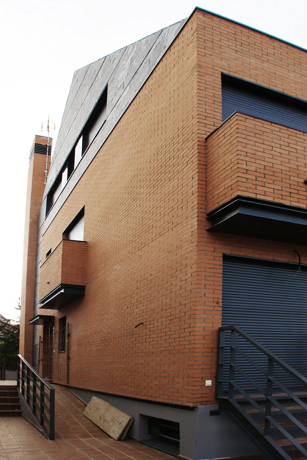 Se trata de una edificación desarrollada en una parcela preexistente con la totalidad de instalaciones urbanas correspondientes. Al exterior el conjunto presenta una marcada volumetría, que combina ladrillo visto con un aplacado de pizarra en negro y teja cerámica plana.