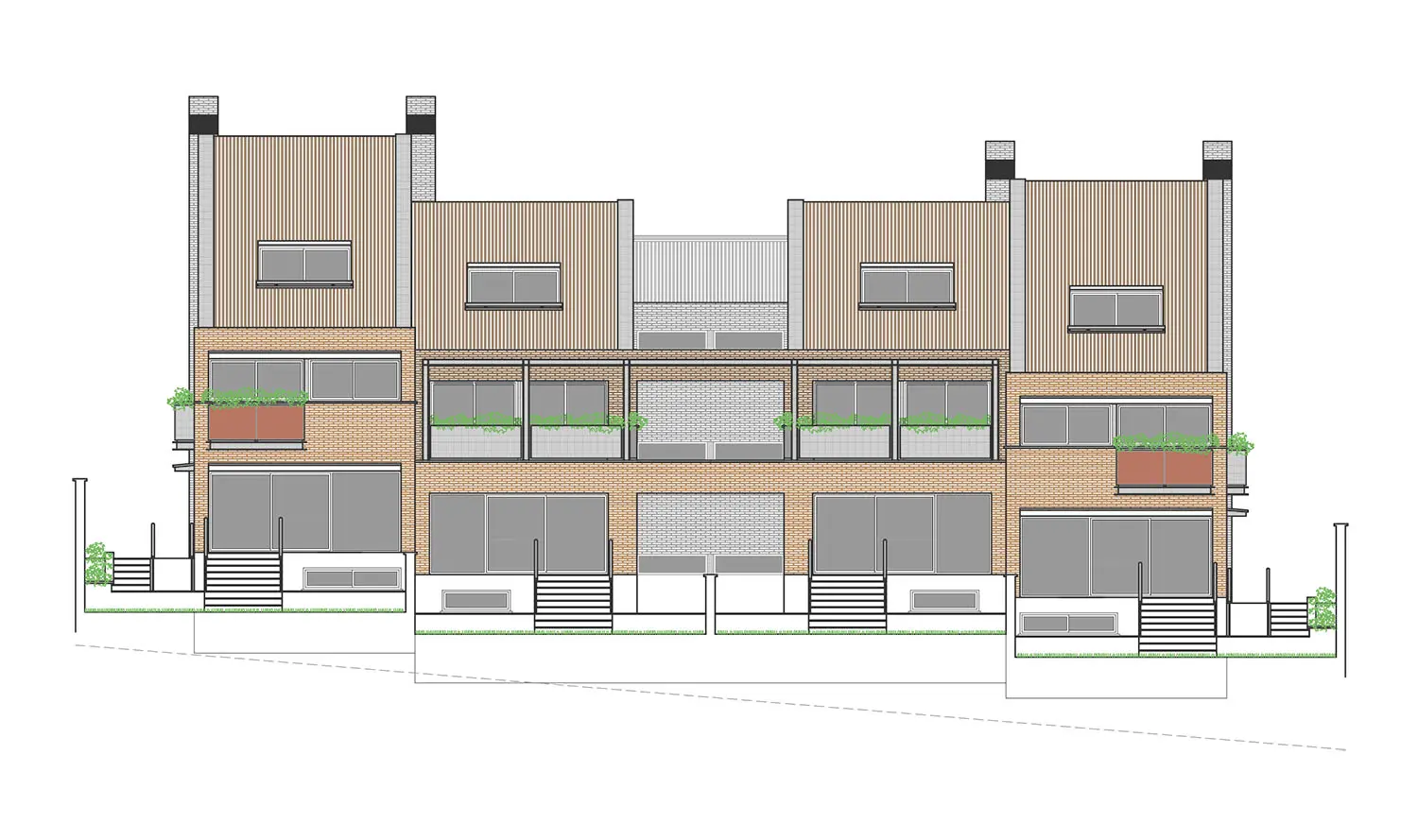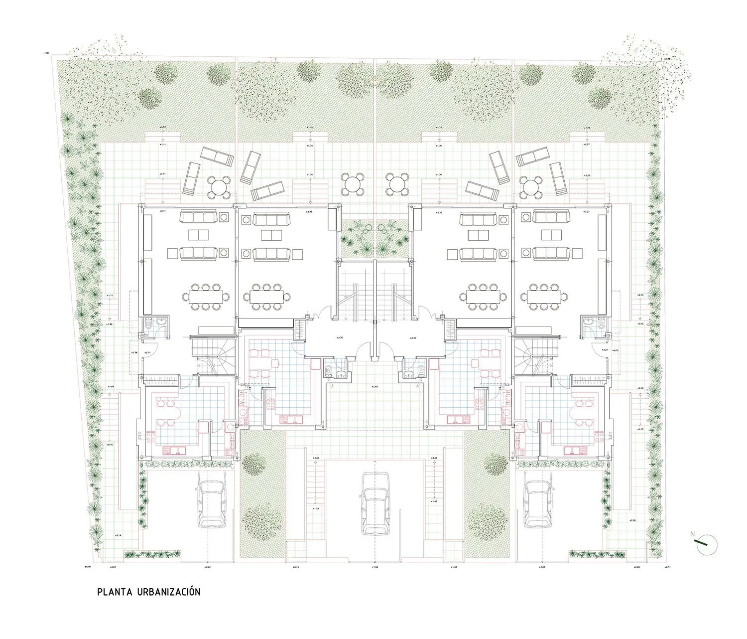Satisfaciendo las necesidades del programa planteado por el promotor, se proyecta una edificación que consta de 3 viviendas unifamiliares. El programa de viviendas consiste en la ubicación de dos tipologías, las laterales y la central de mayores dimensiones, que contemple la posibilidad de dividirse en dos a posteriori. Las viviendas laterales son de tres dormitorios, mientras que la central cuenta con seis, con dos zonas de estar en planta bajo cubierta.